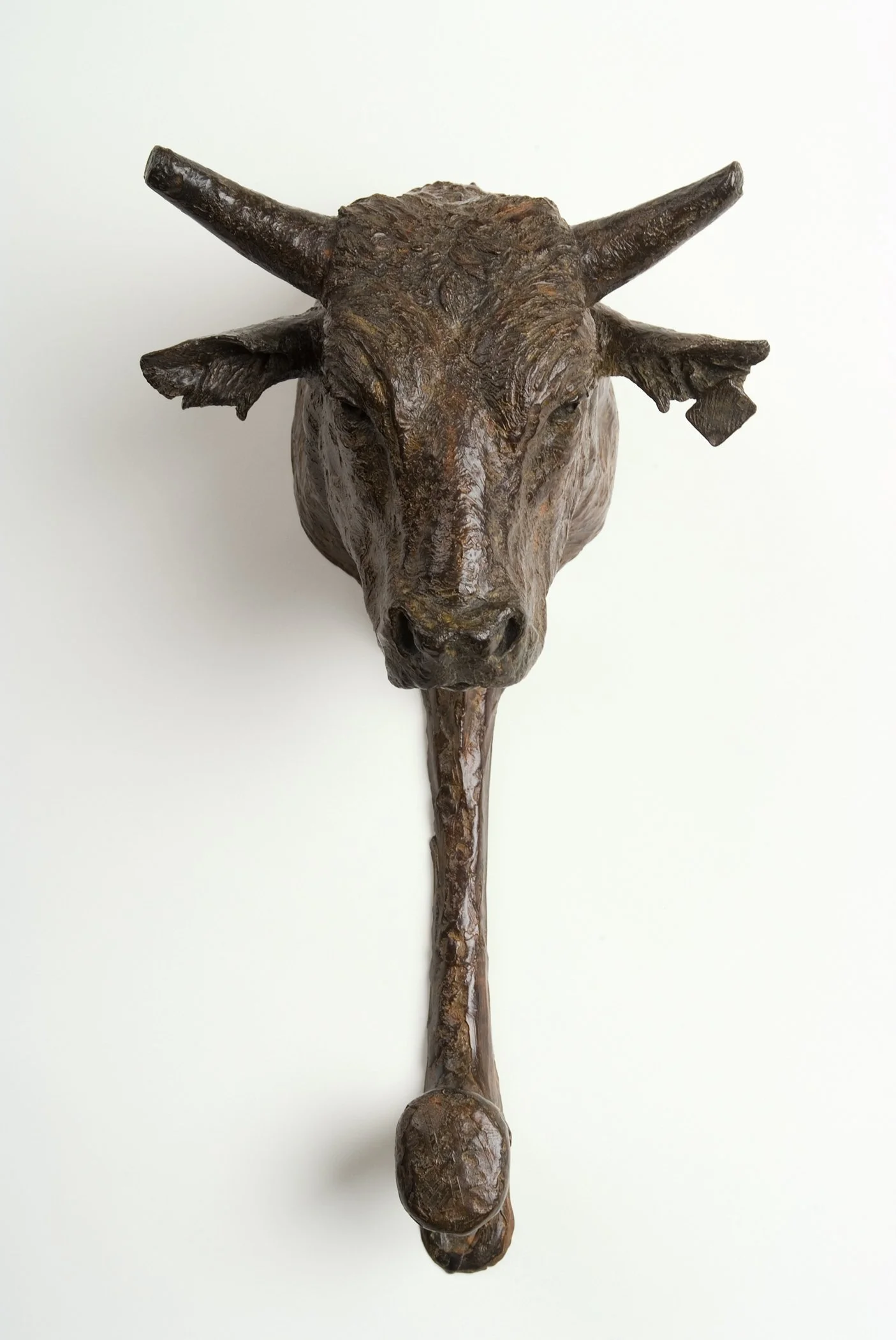 Watching our bulls out in the pasture brought to mind how iconic their nature has become in representing the ideals and people of this country. An entire mind set and attitude is named after them: BULLISH. This new sculpture is functionally designed to hold a cowboy's hat. Your family's brand or initials can be added to the hat pommel and ear tag upon request.