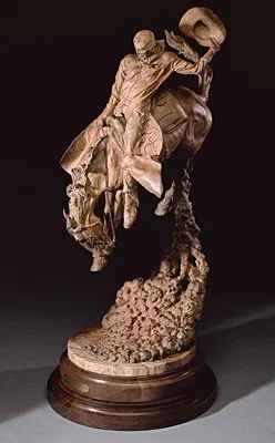 Only a bronc peeler knows the ecstasy of fannin' a rank one. Both bronc and rider boast attitudes of individualism and a hard-nosed sense of freedom. I've seen riders compete with a bronc like they're taking on the world and with each lick they scratch a line that few dare to cross. Each cowboy and each horse have a mission - to win, to conquer, to overcome, to enjoy the trip. It's not only the bronc that exudes the gesture that whispers "Get Off My Back".