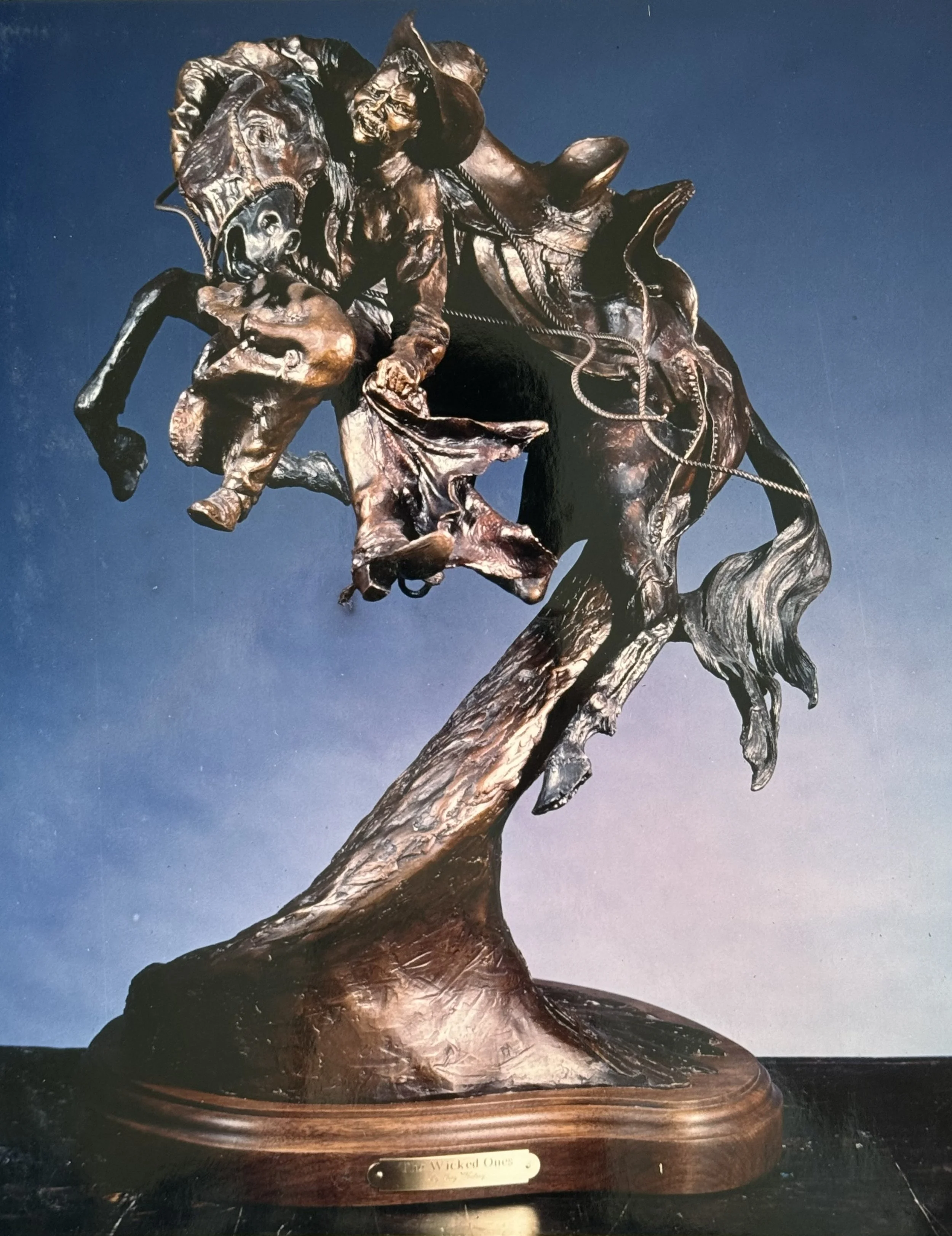 Greg began working on the original clay model in the fall of 1998. While sculpting in the studio of a friend he was struck by lightening with his hands poised above the piece. He was working on a old coal/wood burning stove and sitting on an antique shoe repair stand from the days of Billy the Kid. The lightening hit the stove pipe protruding from the roof, traveled down like blue fingers, then arched off the stove and hit him directly in his left palm. Fortunately, there was no serious or permanent damage. Greg’s greatest fear of naturally occurring phenomenon has always been of being struck by lightening, he would never even get out to get stock gates in a storm. This jolt seemed more like a special gift, in a sense, it touched him with an energy not many people live to tell about while he was in the midst of his second work of art. That jolt certainly seemed to give “The Wicked Ones”, aka “When Lightening Strikes”, an extra energy not easily defined.